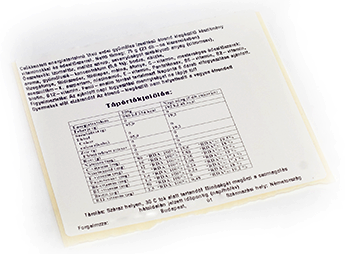 A papírra thermo transfer nyomtatási eljárással dolgozunk, egy festékszalagból „égeti rá” a speciális címkenyomtató a nyomtatandó pixeleket a papírra.